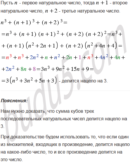 Докажите, что сумма кубов трех последовательных натуральных чисел делится нацело на 3.