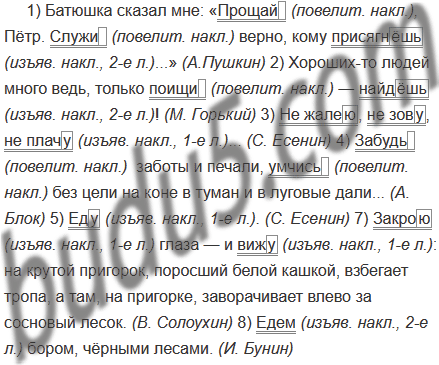 1) Батюшка сказал мне: «Прощай, Пётр. Служи верно, кому присягнёшь...» (А.Пушкин) 2) Хороших-то людей много ведь, только поищи — найдёшь! (М. Горький) 3) Не жалею, не зову, не плачу... (С. Есенин) 4) Забудь заботы и печали, умчись без цели на коне в туман и в луговые дали... (А. Блок) 5) Еду. Тихо. Слышны звоны под копытом на снегу. (С. Есенин) 6) Из-под дивана, из-под бахромы вылезает кот. Потянулся, прыгнул на диван, чёрный и длинный. Идёт, опустив хвост. (А. Н. Толстой) 7) Закрою глаза — и вижу: на крутой пригорок, поросший белой кашкой, взбегает тропа, а там, на пригорке, заворачивает влево за сосновый лесок. (В. Солоухин) 8) Едем бором, чёрными лесами. Вот гора, песчаный спуск в долину. Вечереет. На горе пред нами лес щетинит чёрную вершину. (И. Бунин)