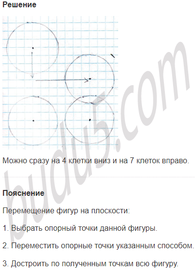 Задание № 6. Используя циркуль, нарисуй круг радиусом 3 клетки. Перенеси его на 9 клеток вниз, затем на 7 клеток вправо, а потом - на 5 клеток вверх. Покажи стрелкой преобразование первого круга в последний.