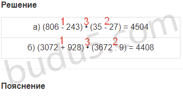 | а) 806 - 243 и 35 - 27 | б) 3072 + 928 и 3672 : 9 |