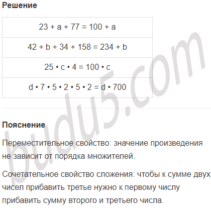 | 23 + а + 77 | 42 + b + 34 + 158 | 25 • с • 4 | d • 7 • 5 • 2 • 5 • 2 |