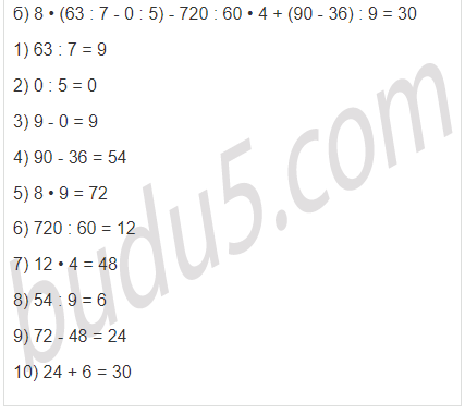 | б) 8 • (63 : 7 - 0 : 5) - 720 : 60 • 4 + (90 - 36) : 9 |