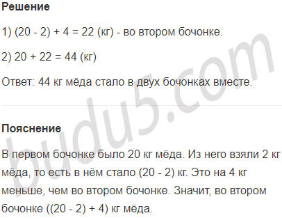 Задание № 6. В первом бочонке было 20 кг мёда. После того как Винни-Пух взял из него 2 кг мёда, в нём осталось на 4 кг меньше, чем во втором бочонке. Сколько мёда стало в двух бочонках вместе?