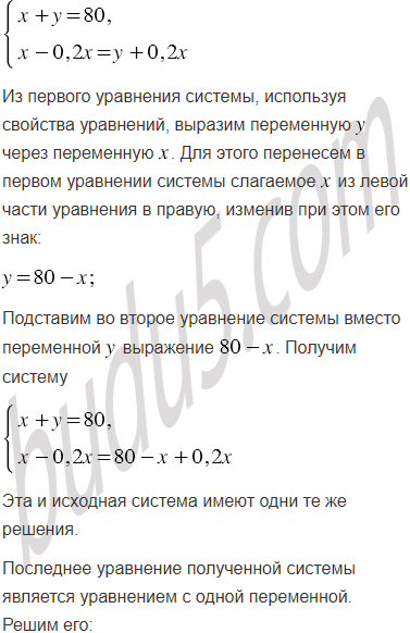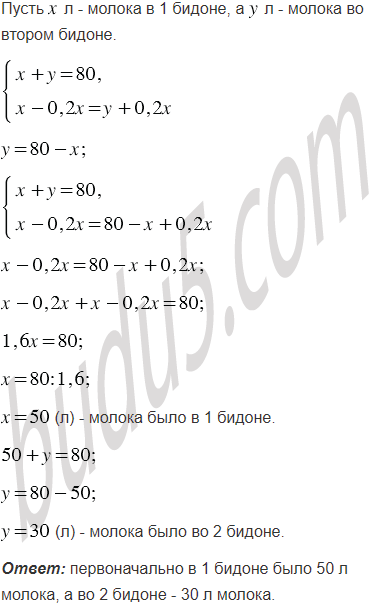 В двух бидонах находится 80 л молока. Если из одного бидона перелить 20% молока в другой бидон, то в обоих бидонах молока станет поровну. Сколько литров молока было в каждом бидоне первоначально?