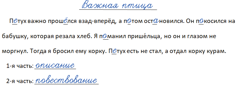 П_тух важно прош_лся взад-вперёд, а п_том ост_новился. Он п_косился на бабушку, которая резала хлеб. Я п_манил прише́льца, но он и глазом не моргнул. тогда я бросил ему корку. П_тух есть не стал, а отдал корку курам.
