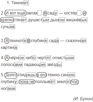 1. Темнеет. 2. И вот ещё запах: в саду — костёр, и крепко тянет душистым дымом вишнёвых сучьев. 3. В темноте в глубине сада — сказоч(?)ная картина. 4. А ч..рное небо чертят огнистыми полосками падающие звёзды. 5. Долго глядишь в его тёмно-синюю глубину, пока не поплывёт земля под ногами.