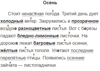 Стоит ненастная погода. Третий день дует3 (какой?) ветер. Закружились в (каком?) воздухе (какие?) листья. Вот с берёзы падают (какие?) листочки. На дорожке лежат (какие?) листья осинки2, (какие?) листья тополя. Улетают последние перелётные птицы. Появились осенние зайчата — листопаднички.