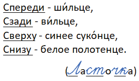 Объясняем отгадку. У ласточки спереди шильце - клюв (он тоненький и острый, напоминает шила), сзади вильце - хвост (хвост ласточки напоминает вилку с двумя зубцами); сверху - синее суконце - верхняя часть туловища ласточки чёрно-синяя; снизу - белое полотенце - грудка у ласточки белого цвета.