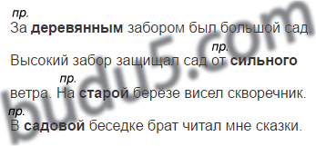 (За) ... забором был большой сад. Высокий забор защищал сад (от) ... ветра. (На) ... берёзе висел скворечник. (В) ... беседке брат читал мне сказки.