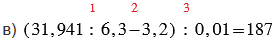 в) (31,941 : 6,3 - 3,2) : 0,01;