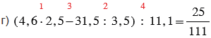 г) (4,6 • 2,5 - 31,5 : 3,5) : 11,1.