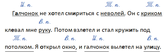 Галчонок (И. п.) не хотел смириться с неволей (Т. п.). Он с криком (Т. п.) клевал мне руку (В. п.). Потом взлетел и стал кружить под потолком (Т. п.). Я открыла окно (В. п.), и галчонок (И. п.) вылетел на улицу (В. п.).