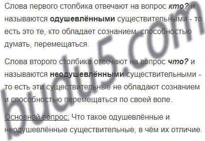 Прочитай имена существительные в столбиках. Существительные первого столбика называются одушевлёнными, второго – неодушевлёнными. Как ты думаешь почему? Подумай над значением однокоренных слов: душа, дух, душевные (переживания).