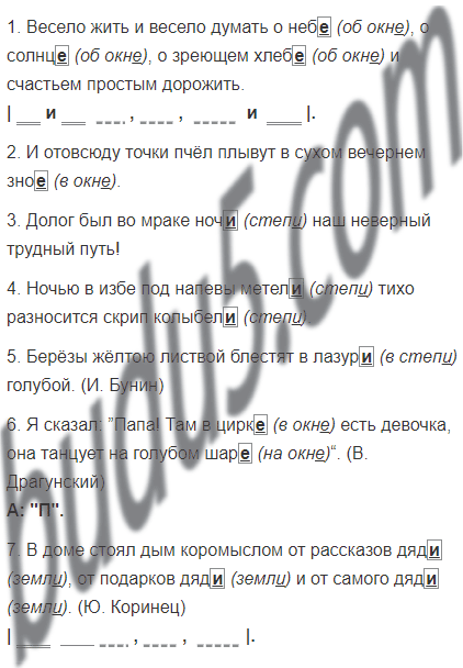 1. Весело жить и весело думать о неб_, о солнц_, о зреющем хлеб_ и счастьем простым дорожить. 2. И отовсюду точки пчёл плывут в сухом вечернем зно_. 3. Долог был во мраке ноч_ наш неверный трудный путь! 4. Ночью в избе под напевы метел_ тихо разносится скрип колыбел_. 5. Берёзы жёлтою листвой блестят в лазур_ голубой. (И. Бунин) 6. Я сказал: ”Папа! Там в цирк_ есть девочка, она танцует на голубом шар_“. (В. Драгунский) 7. В доме стоял дым коромыслом от рассказов дяд_, от подарков дяд_ и от самого дяд_. (Ю. Коринец)